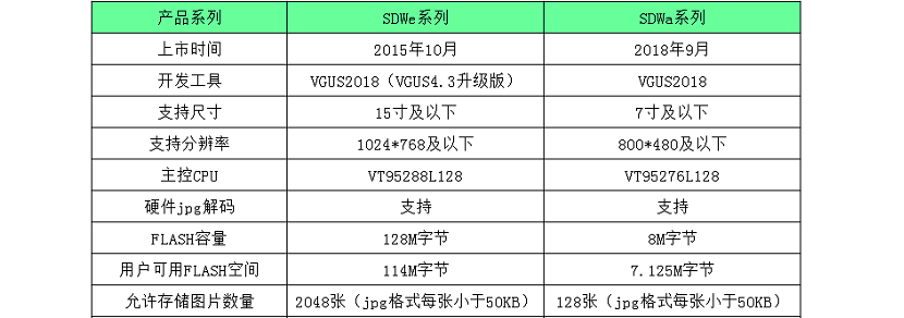 SDWa系列串口屏相較于SDWe系列而言,減小了DRAN容量和Flash容量,只為提供更高性價比產(chǎn)品,開發(fā)方式依然使用VUGS組態(tài)軟件不變。