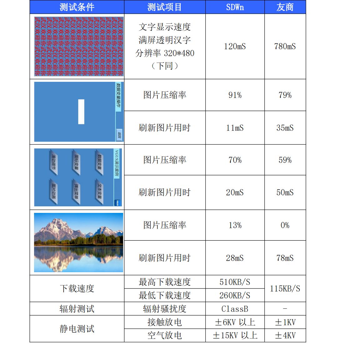 設(shè)計利用CPU并行機制讓讀寫flash數(shù)據(jù)和刷新屏幕數(shù)據(jù)同時進行,極大的提高了顯示速度,讓刷屏痕跡的現(xiàn)象一去不復返。對于以簡單純色為主的圖片,3.5寸屏刷屏時間僅需要10mS。而目前市場上類似方案的串口屏,3.5寸屏刷屏時間普遍都在50-100mS左右。