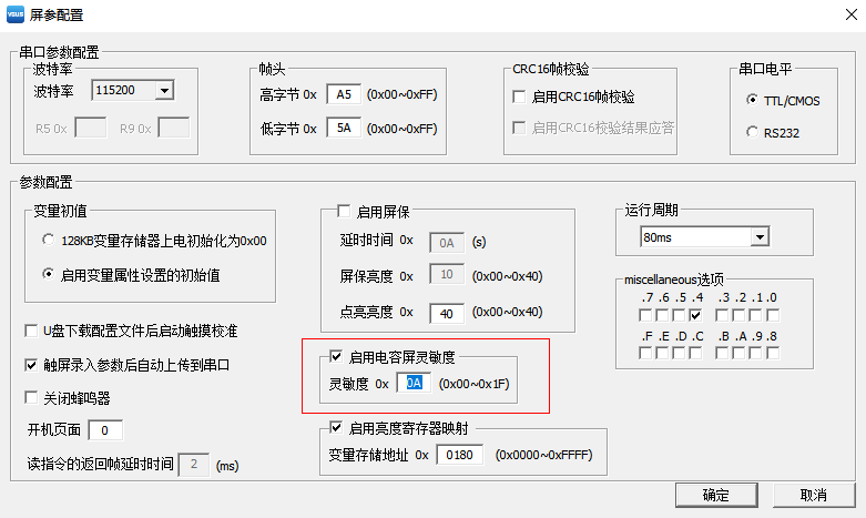 編譯對應(yīng)的工程,電容觸摸屏靈敏度值將保存在工程文件中。當用戶下載工程文件到串口屏中時,電容觸摸屏靈敏度參數(shù)也會一同更新到串口屏中。