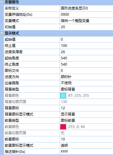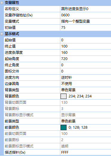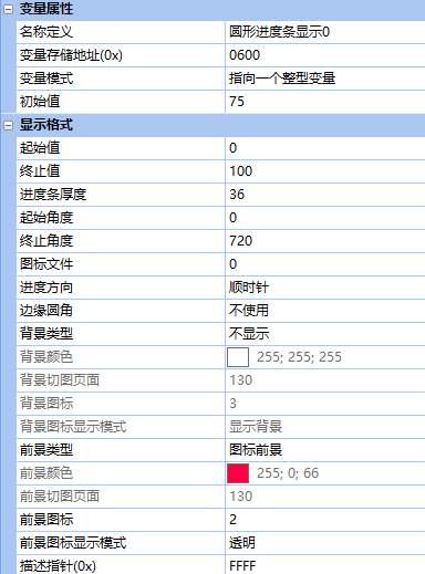 在VGUS組態(tài)軟件中,控件位置為:變量配置->圓形進(jìn)度條顯示。